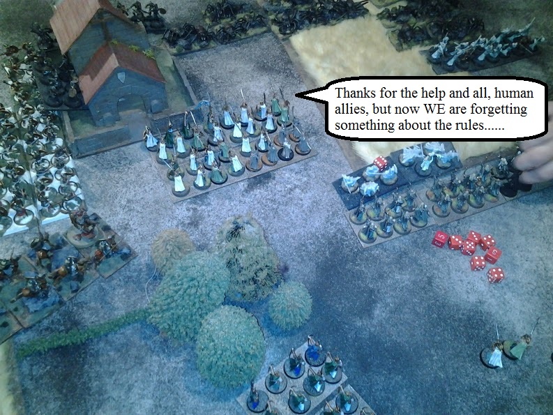 The Elve's have some thick armour on them too. Thankfully, their boot-licking dupes amongst the men of Rhovanion are pathetically eager to join alongside them. So our elite 'Tower Orcs' cut the men down first and threw them back. Their retreat had the useful byproduct of trampling a few Noldor too.